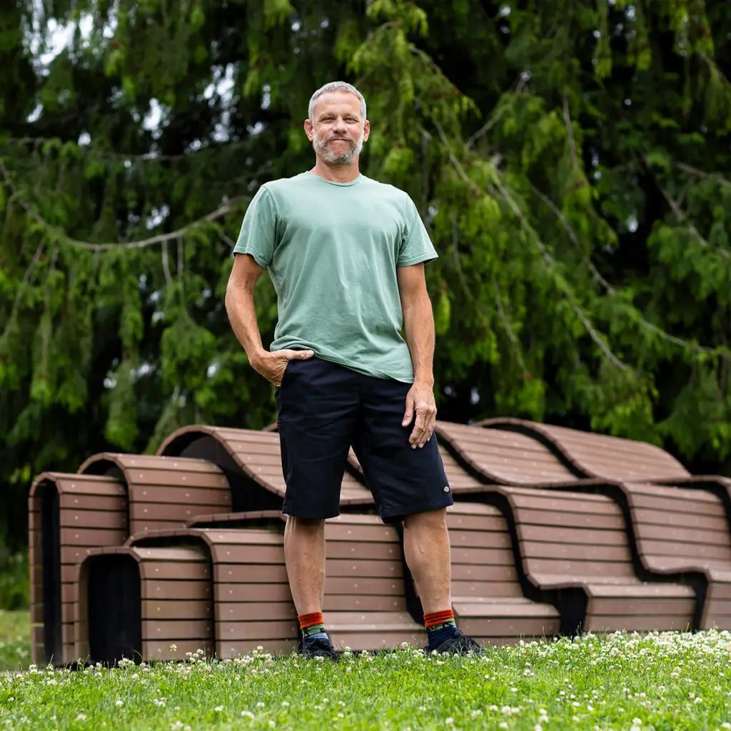Scott’s early inspirations were discovering contrasting elements in nature; the derelict combine harvester on an old farm, the rusted steam donkey hidden up in the Sierras, and flotsam relics washed up on California coasts. The repetition of textures, pattern, and color juxtaposed to the context in which they were found. This is the thread that runs deep in his artwork. There is an inherent physicality and repetitive modality in technique and use of materials in creating his site specific sculptures that straddle the worlds between art, architecture, and the contrasting settings in which they reside. The intension of the artwork is to be accessible, facilitate ones own narrative, and encourage exploration.