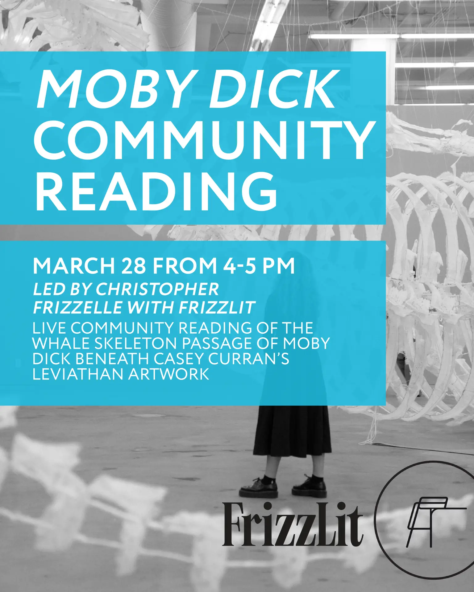 On March 28, from 4-5PM come experience the words of Herman Melville under the canopy of Casey Curran’s Leviathan artwork, performed by students and museum attendees. Participants will read the whale skeleton passage 1 sentence at a time aloud through a microphone for all guests to hear. No need to bring anything except yourself.