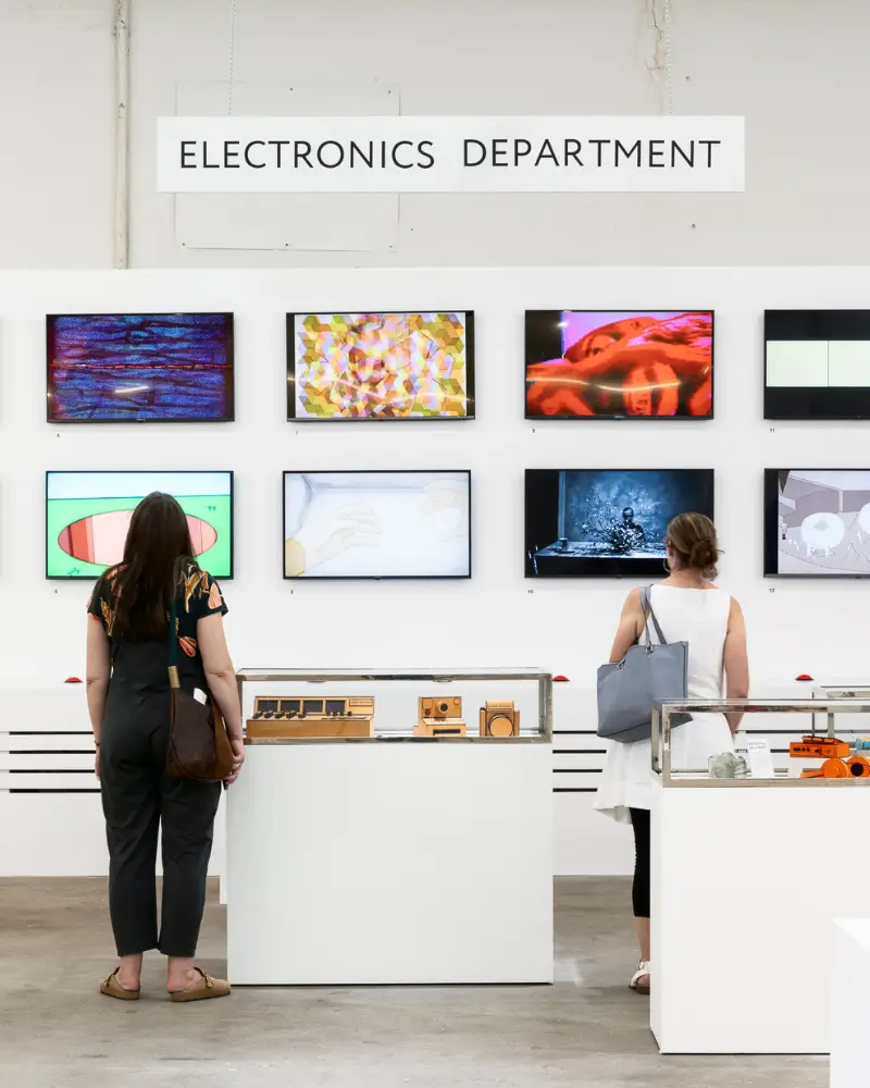 The Electronics Department features a revolving collection of clay cell phones, wood laptops and carboard boomboxes. We have a collection of artist-modified refrigerators, sculptural gadgets and a wall of monitors exhibiting a wide variety of digital media, from animation to music videos to experiments in sound and vision.