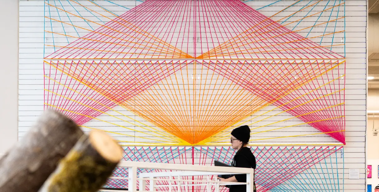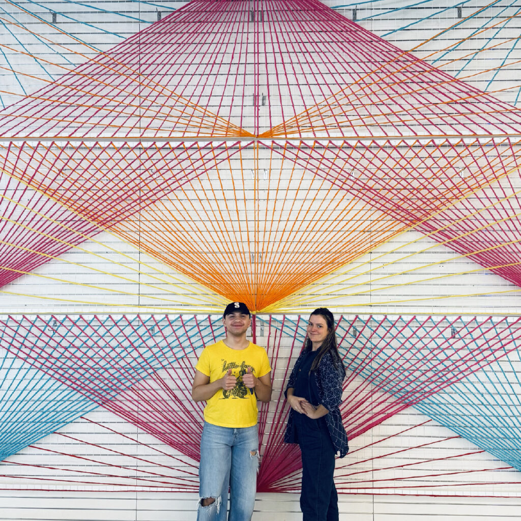 With Untitled, Christy Caravaglio combines the simplest of elements to create bright geometric patterns in community spaces. Just as traditional fiber crafters used what was at hand to make things both useful and uplifting, so Christy uses common materials to transform ordinary spaces into unexpected moments of delight.