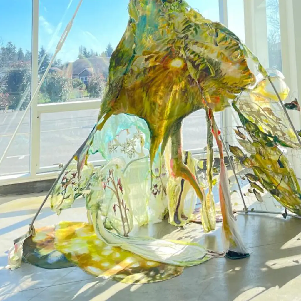 Niki’s painted sculptures use imagery of her home: forests, waterways, gardens, underwater creatures and stellar nurseries. Nurse Log reflects on the intelligence inherent in our forests. It explores the phenomena of a nurse log where a tree falls and a new tree grows, using its nutrients. The nurse log decays leaving a void in the surrounding root system for light to find its way. This window effect is found in delicate canvas and gauze as they weave together a moment that could feel fleeting or a moment that has limitless possibility. The lightness of the material, see-through in some areas, allows the viewer to imagine floating through the scene themselves, through the void of the nurse log, connected to nebula above. Nurse Log is a diptych, one part rests on the floor, the other is suspended. The above/below orientation reflects her interest in connection and the present moment.